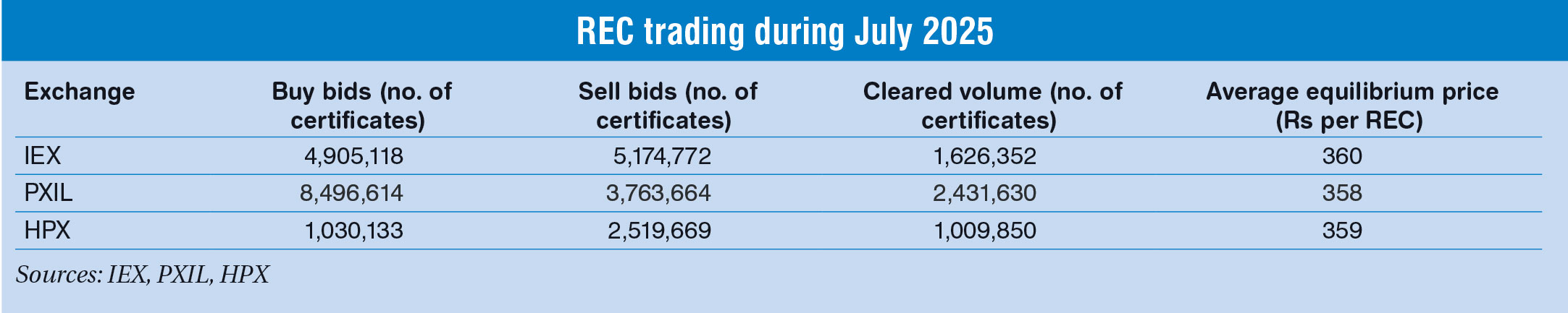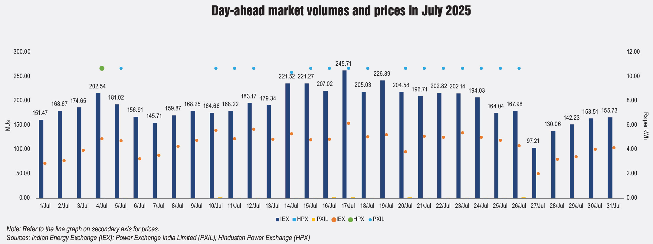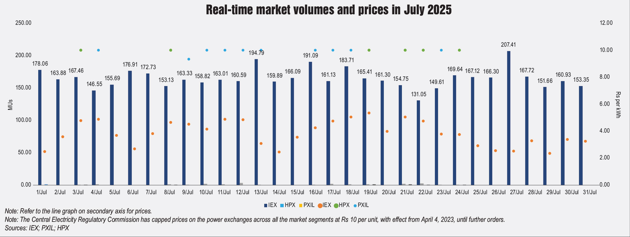 The electricity traded in the day-ahead market in July 2025 was 5,542.98 MUs at the IEX. The average market clearing price range was Rs 1.92 per unit to Rs 5.77 per unit at the IEX. The total volume traded in the real-time market was Rs 5,123 MUs at the IEX.