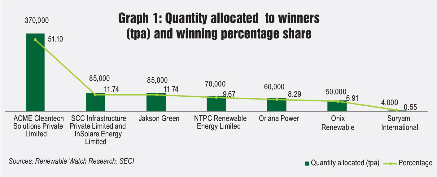 ACME has won the highest cumulative capacity, winning 370,000 tpa across six different auctions (Graph 1). It accounts for more than half of the entire allocation (51.1 per cent). The next largest players are Jakson Green (winning 85,000 tpa) and a joint venture of SCC Infrastructure and InSolare Energy (a total capacity of 85,000 tpa across two auctions). Each winner accounts for 11.7 per cent of the entire allocation. Other winners include NTPC Renewable Energy Limited (9.7 per cent), Oriana Power (8.2 per cent), Onix Renewable Limited (6.9 per cent) and Suryam International (0.6 per cent).