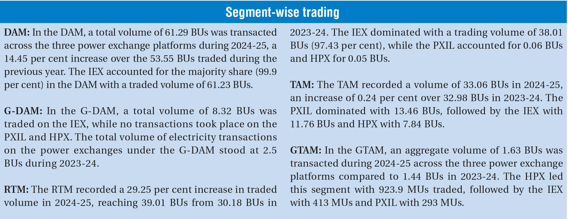 During 2024-25, a total of 1,572 BUs of electricity was supplied in the country. Of this, 108.62 BUs was traded through the three power exchanges (Indian Energy Exchange Limited [IEX], Power Exchange India Limited [PXIL] and Hindustan Power Exchange [HPX]), 97.58 BUs was transacted through bilateral trade, and 32.14 BUs was transacted through deviations. In comparison, in 2023-24, the total supply was 1,739.09 BUs, including 121.49 BUs through the power exchanges, 69.94 BUs through bilateral trade and 26.78 BUs through deviations, reflecting a shift in the composition of short-term transactions.