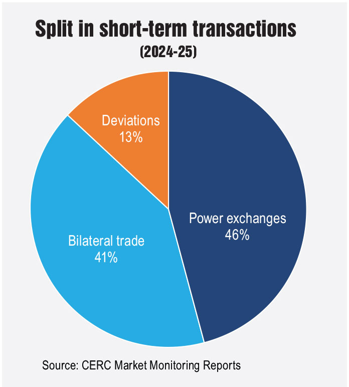 The total volume of short-term electricity transactions, including the deviation settlement mechanism (DSM), increased from 65.9 BUs in 2009-10 to an all-time high of 238.35 BUs in 2024-25. Year on year, this marked a growth of 9.22 per cent over the 218.22 BUs registered in 2023-24. Short-term trading and DSM together accounted for about 15 per cent of total electricity generation in FY 2025.