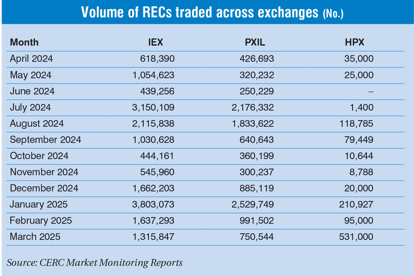 According to the CERC Annual Report on Market Monitoring, 11.6 million renewable energy certificates (RECs) were transacted in 2023-24. Based on data collated from monthly reports, a total of 30.42 million RECs were traded on the exchanges in 2024-25.