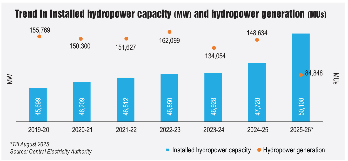 According to the CEA’s National Electricity Plan 2023, the installed hydropower capacity is projected to reach 88 GW by 2031-32, including 26 GW from PSPs, requiring an estimated investment of Rs 3.2 trillion. As of September 2025, 25,333.5 MW of large hydropower projects (including PSPs) are under construction, with 11,182 MW in the central sector, 6,241.5 MW in the state sector and 7,910 MW in the private sector. About 1,735 MW of new capacity is expected to be commissioned in 2025-26.