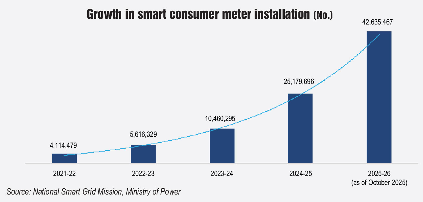 As of mid-2025, over 224 million smart consumer meters have been sanctioned nationwide, of which 143.9 million meters have been awarded. Further, 5.3 million distribution transformer (DT) meters and 206,929 feeder meters have been sanctioned, of which 4.72 million DT meters and 182,156 feeder meters have been awarded.