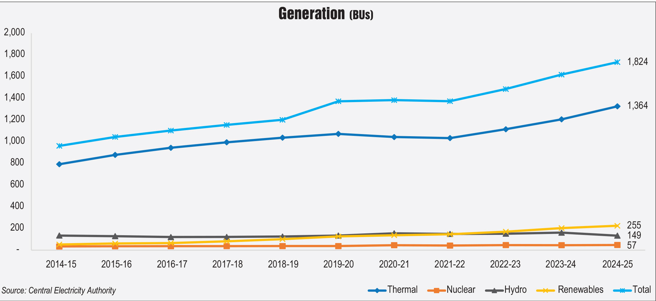 Power generation grew at a CAGR of 5.74 per cent to reach 1,824 BUs in 2024-25 from 1,044 BUs in 2014-15. Thermal generation accounted for 74.77 per cent of total generation in 2024-25, renewables accounted for 13.98 per cent, hydro accounted for 8.15 per cent and nuclear accounted for 3.11 per cent.