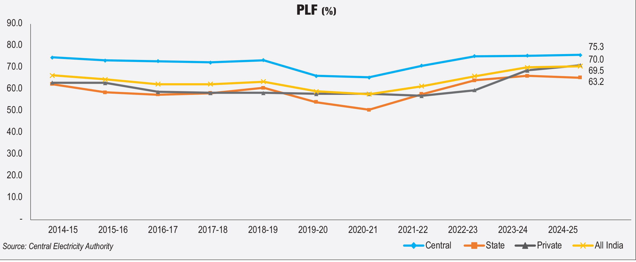 The national plant load factor (PLF) of thermal power stations registered an increase from 64.5 per cent in 2014-15 to 69.5 per cent in 2024-25.