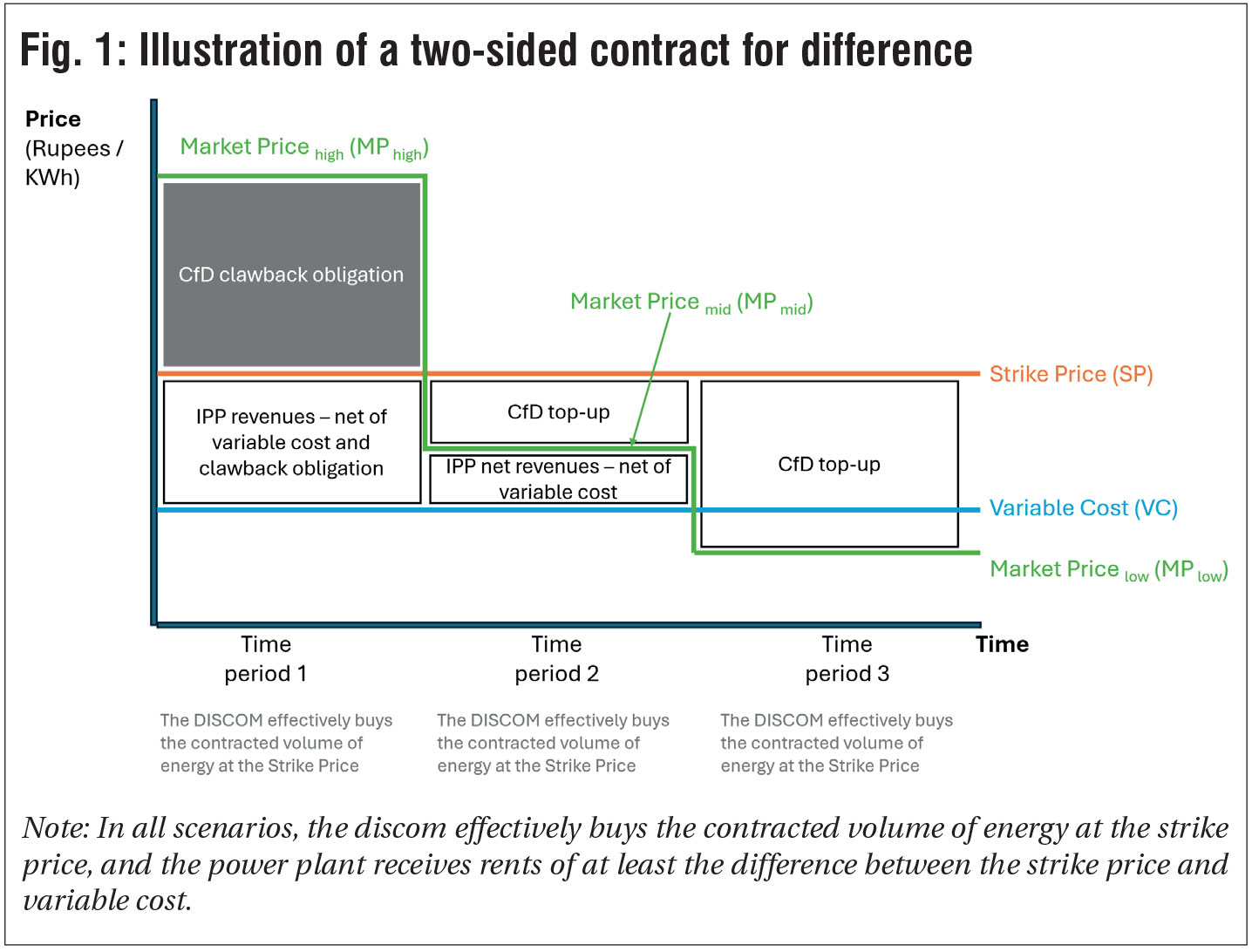 - When the market price is below the IPP’s variable cost, the IPP receives from the buyer a “top-up” payment of the strike price minus market price (SP-MP low), irrespective of whether it offers its output to the market. For the IPP, the value of offering and selling its output in the market is negative, as the variable cost exceeds the market price. So, the resource is, correctly, not scheduled in the market. Thus, the IPP’s net cash inflow from the market is zero, and the buyer provides the IPP with a margin of the strike price minus market price (SP-MP low) that will help cover its fixed costs. In this transaction, the buyer has a cash outflow for purchasing power from the market at the SP. In sum, the buyer has effectively hedged, the IPP has correct incentives to operate accordingly (in this case, by not scheduling in the market), and the IPP has a margin to contribute towards fixed cost recovery. The bumper margins for the IPP in time period 3 (Fig. 1) may, to some extent, be captured by consumers through competition in setting the strike price.
