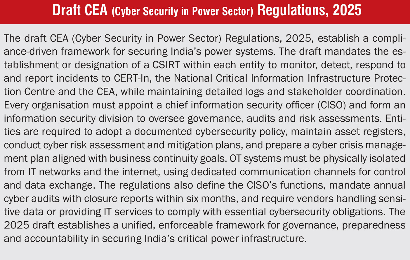 India has progressively built a layered cybersecurity framework for the power sector, particularly around smart metering and digital infrastructure. Foundational standards, such as IS 16664 and the Central Electricity Authority (CEA) Cyber Security Guidelines, 2021, established core controls for tamper detection, data integrity and system resilience. These were followed by the Draft Cyber Guidelines, 2024, which introduced structured oversight through the Computer Security Incident Response Team – Power (CSIRT-Power), operational security officers and annual audits. Recently, the CEA released the draft Cyber Security in Power Sector Regulations, 2025, marking a shift from advisory guidelines to a framework of enforceable compliance.