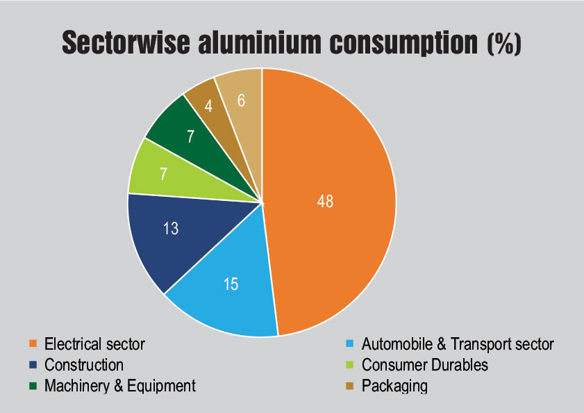 Sector-wise, aluminium consumption in India is dominated by the electrical sector, which accounts for nearly 48 per cent of the total use. The automobile and transport sector accounts for around 15 per cent of the consumption, followed by construction (13 per cent), consumer durables (7 per cent), machinery and equipment (7 per cent), packaging (4 per cent) and other uses (6 per cent). In the automotive sector, aluminium can reduce vehicle weight by up to 40 per cent compared to steel, significantly improving fuel efficiency and extending the driving range of electric vehicles.