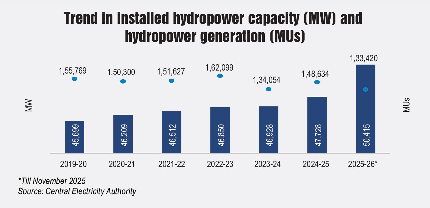 Large-hydro generation during AprilNovember 2025 reached 133.42 billion units (BUs), reflecting a 13.3 per cent increase over the same period in the previous year. Meanwhile, small-hydro generation rose by 6.59 per cent to 9.55 BUs. During 2024-25, hydropower (large and small) accounted for 40 per cent of total renewable energy generation and 8.76 per cent of overall power generation.