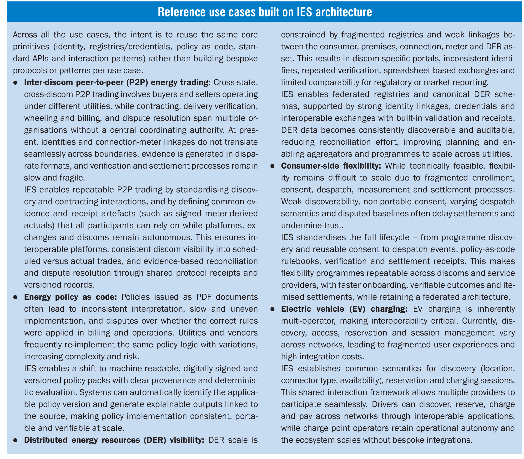 The IES aims to build open, interoperable and secure DPI for the power sector that would enable seamless participation, innovation and efficient coordination among various stakeholders, including consumers, utilities, markets and energy assets. It builds on the concept of DPI within the power sector, similar to Aadhaar, unified payments interface, DigiLocker, eKYC and eSign.