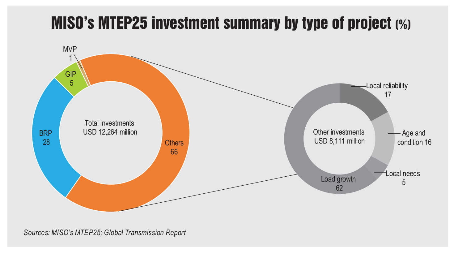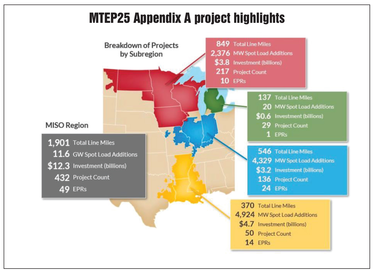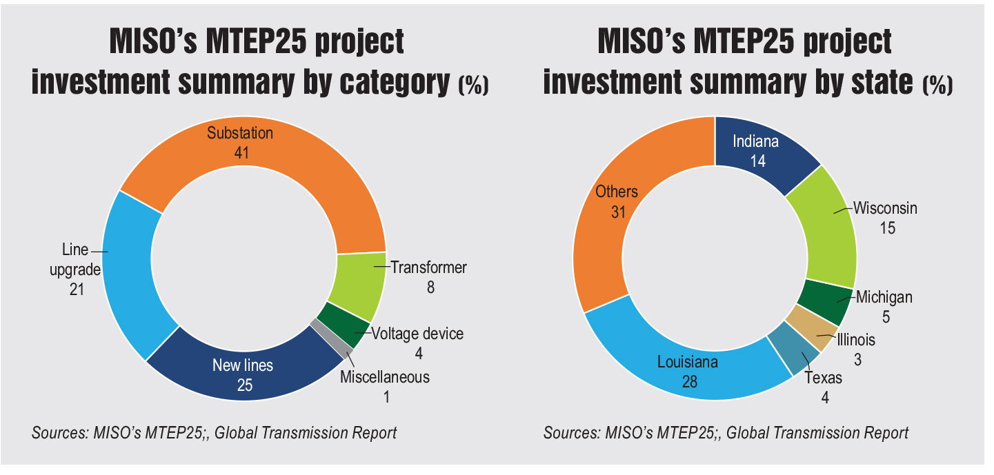 In total, MTEP25 includes approximately 1,901 miles (3,060.6 km) of new or upgraded transmission lines. Of these, 29 per cent are expected to enter service by 2028 and 93 per cent by 2030. More than half of the mileage, about 1,041 miles (1,676 km), will operate at 345 kV or above. Notably, the 10 largest projects account for roughly $5.4 billion, or 44 per cent of the total MTEP25 investment value.