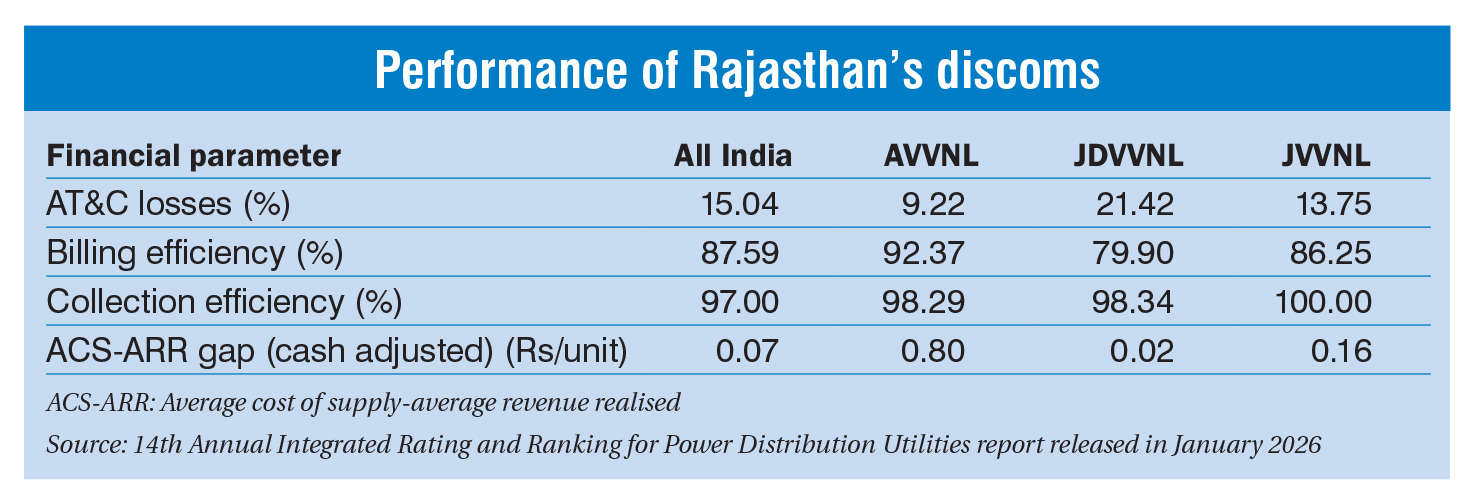 As the share of renewable energy in India’s power mix continues to rise, the operational and financial health of discoms has become increasingly critical, particularly given the variable and decentralised nature of renewable generation. In this context, Rajasthan’s discoms exhibited a mixed performance in FY2025 compared to the all-India average. As can be observed from the table, compared to the national average, Ajmer Vidyut Vitran Nigam Limited (AVVNL) performed better, with lower aggregate technical and commercial (ATaC) losses and stronger billing and collection efficiency. Jaipur Vidyut Vitran Nigam Limited (JVVNL) remained largely aligned with national trends and maintained high collection efficiency. In contrast, Jodhpur Vidyut Vitran Nigam Limited (JDVVNL) underperformed relative to both the national average and the other two discoms, with higher losses and weaker billing efficiency.