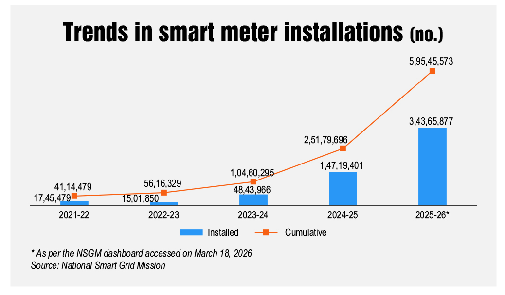 In the smart metering space, the Revamped Distribution Sector Scheme, with a total outlay of Rs 3 trillion, is driving the adoption of smart meters in a significant way. The scheme, which envisages the installation of 250 million smart consumer meters, originally had a sunset period of March 2026; however, this is now set to be extended to March 2028. As of March 18, 2026, nearly 60 million smart consumer meters have been installed across the country. In 2025-26, smart meter installations crossed 34 million – nearly double the additions recorded in the previous year. Early adopter states have begun witnessing tangible improvements from smart metering in billing and collection efficiencies, as well as loss reduction.